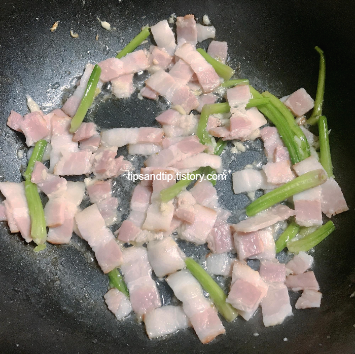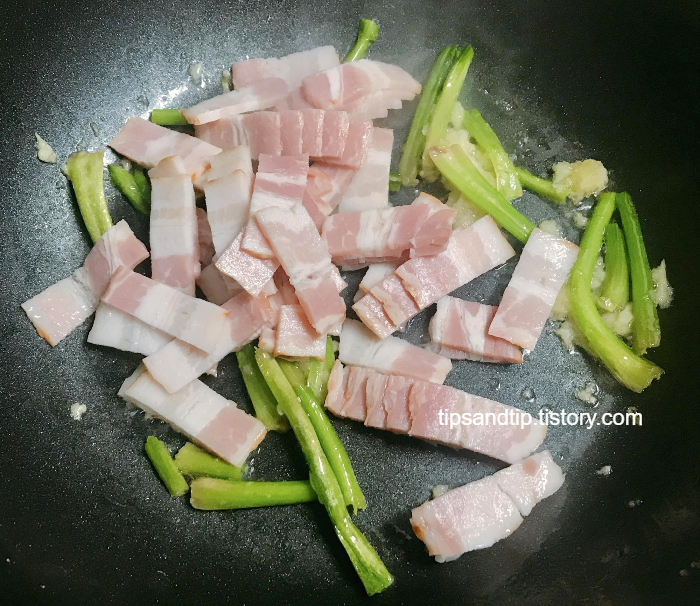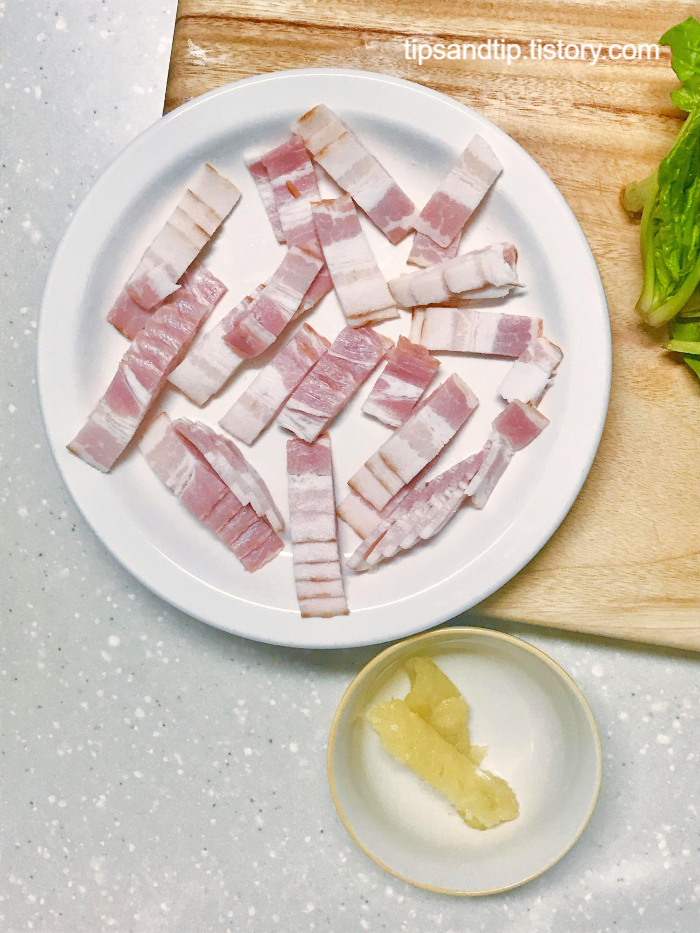 베이컨(2cm 폭으로 자르기)과 다진 마늘 반 스푼 준비.