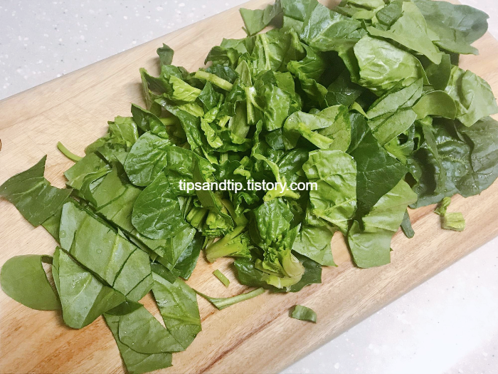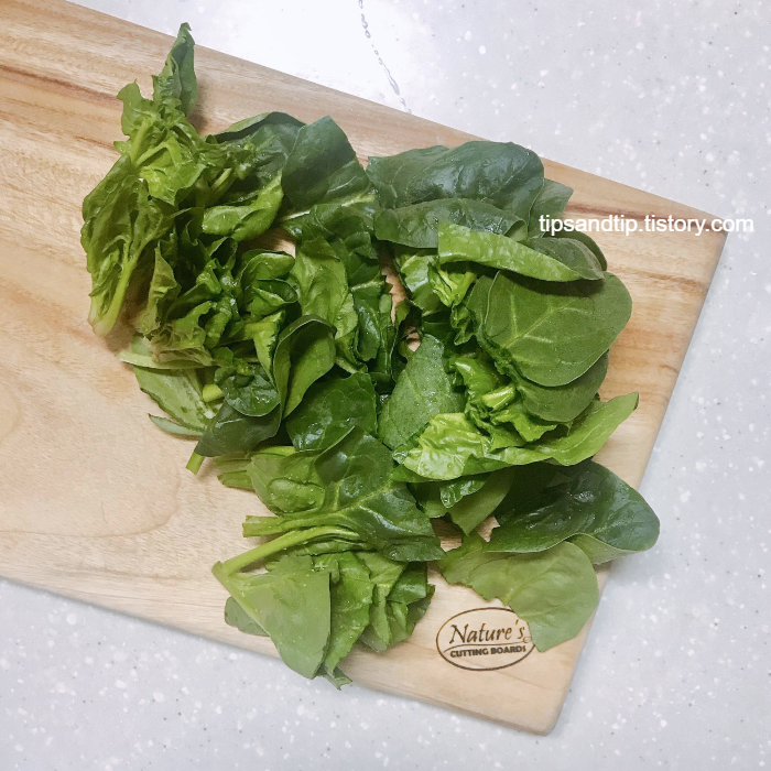 깨끗이 씻은 시금치를 적당히 썰어줘요. 요건 생으로 먹을 거라서 시금치 볶음용 보다 작게 썰었어요.
