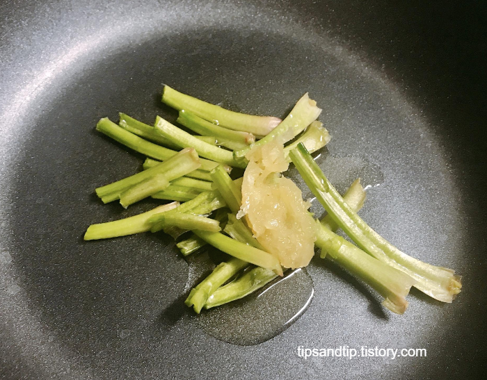 우선 기름에 다진 마늘부터 볶아주는데요, 저는 시금치 줄기 중에 좀 굵은 부분도 첨부터 같이 볶아줬어요.