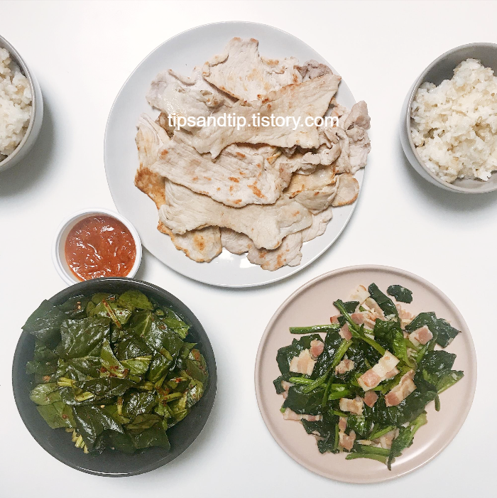 얼마 전 티비에서 본 만남의 광장 시금치 레시피가 넘 신선했기에 시금치를 사와서 시금치 볶음과 시금치 무침을 따라해봤어요.^-^ 시금치는 늘 무침으로만 해먹어서 베이컨을 넣은 시금치 볶음과 고기에 싸먹는 시금치 무침(겉절이) 맛이 너무 궁금했어요.
