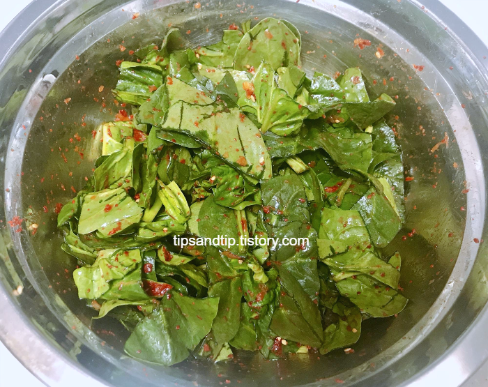 시금치에 고추가루 살짝, 다진 마늘 반스푼, 소금 약간, 참기름 혹은 들기름을 넣어주고, 잘 섞어줍니다. 평소에 고기랑 먹으려고 만드는 상추 겉절이에는 식초 성분이 들어가는데, 여기는 소금 간만 해서 숨이 잘 안죽더라구요. 잘 안 섞여서 열심히 섞어줬어요.