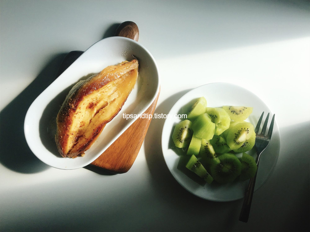 고구마가 목구멍을 답답하게 할까봐 같이 먹은 키위. 패밀리 레스토랑 최애 사이드 메뉴 중 하나인 허니버터꿀고구마 만들기~! 정말 쉽습니다. 집에서 간편하게 건강한 간식 만들어 먹어요~^-^