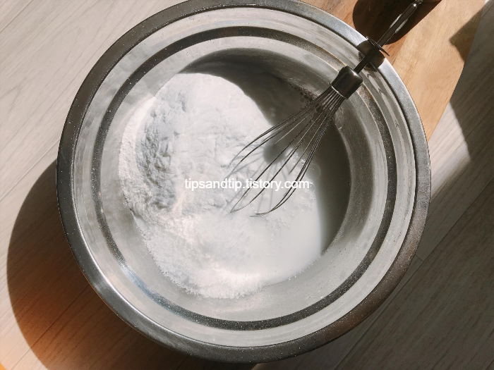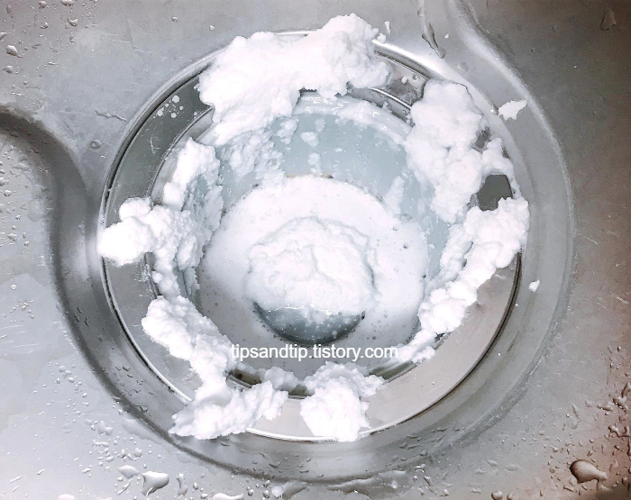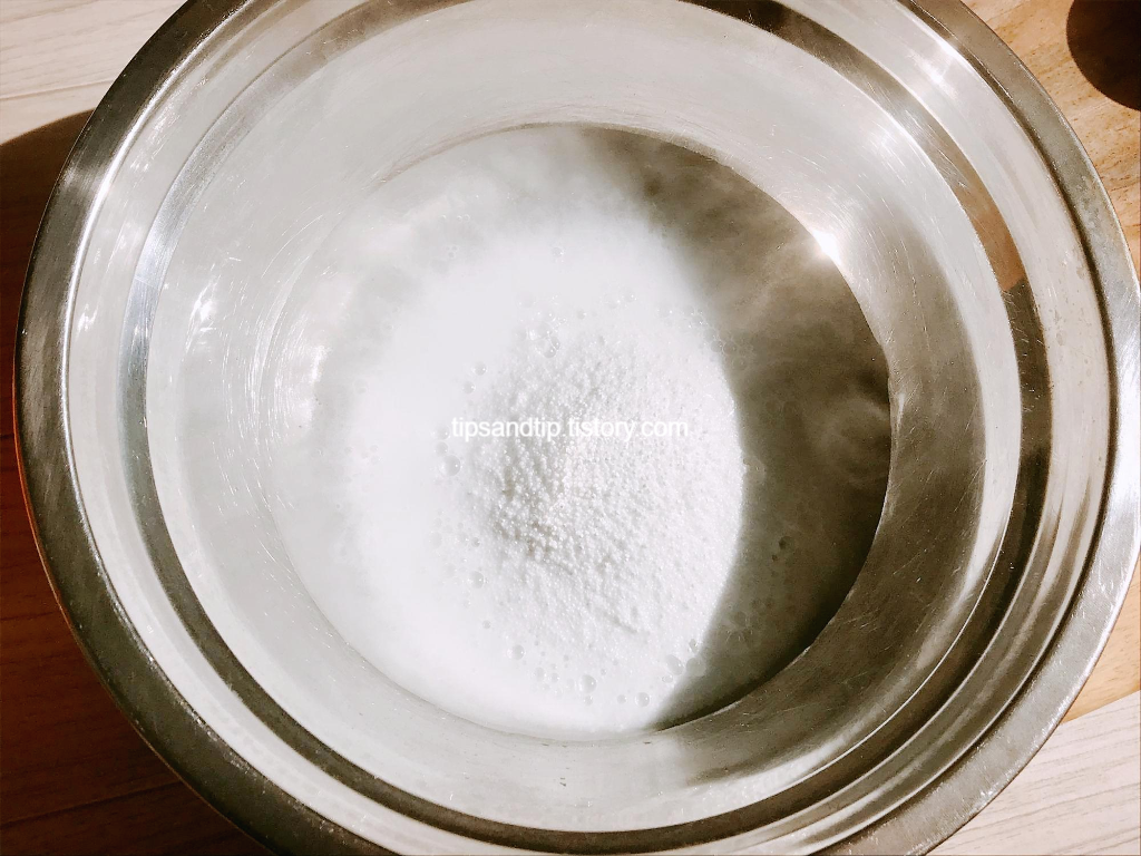 재료 : 과탄산소다 1컵, 뜨거운 물 2컵, 베이킹소다 5컵, 소금 2컵, 치약 반컵, 식초 4컵 - 소주잔 기준