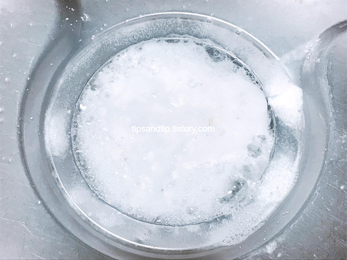 15분 정도 싱크대를 사용하지 않고 내버려둔 뒤 뜨거운 물을 부으면 이렇게 오염 찌꺼기와 함께 끓어올라요. 골고루 여러 번 뜨거운 물을 뿌려주고 수돗물과 재활용 칫솔로 세척을 시작합니다.