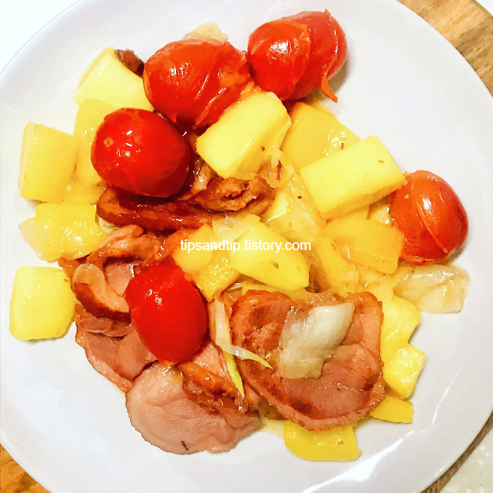담날 저녁으로 꺼내든 훈제 오리 다리살. 야채랑 볶아먹어야지 하면서 생각난 망고까지 넣고 같이 볶게 되었네요.