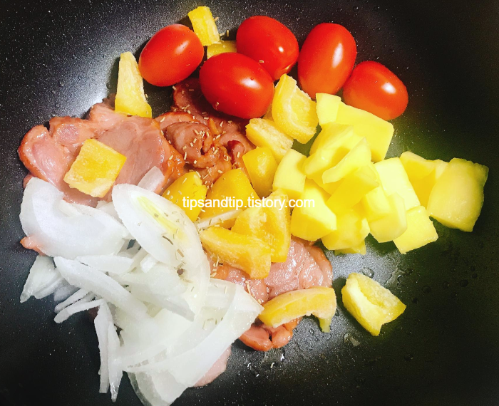 양이 많아 보여서 반은 덜고 반만 남기고, 썰어둔 파프리카와 양파를 넣고, 기름에 익혀먹으면 흡수가 더 잘되는 방울 토마토와 전날 썰어둔 망고를 추가했어요. 망고랑 파프리카랑 색이 비슷해서 잘 구별이 안 되네요. ㅎㅎ 혹시나 망고가 맛 없을까봐 올리고당 약간 넣어주고, 풍미를 올리려고 로즈마리를 살짝 뿌려서 볶았어요. 훈제오리에 이미 간이 되어있어서 간장이나 굴소스 같은 양념은 넣지 않았어요.