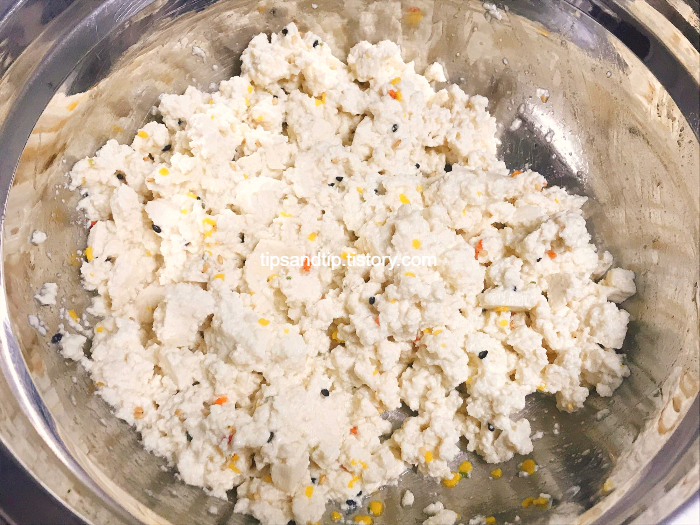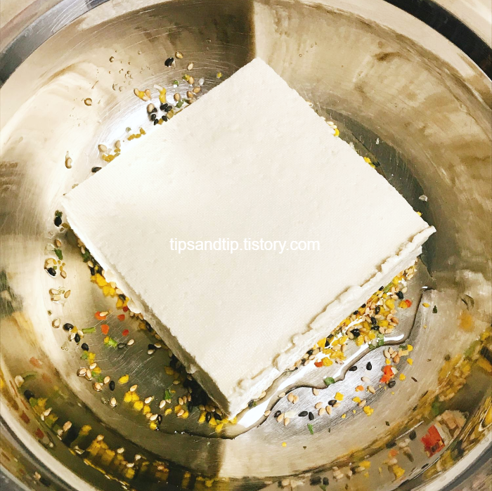 두부를 으깨고 섞어줬어요. 사진으로만 봐도 수분이 좀 많아보이죠? ㅎㅎ