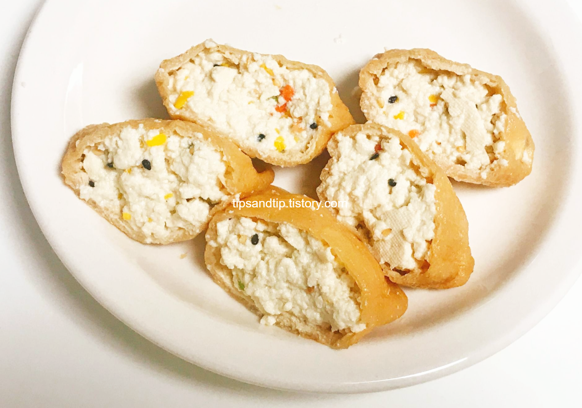 유부를 벌려서 두부를 채워줍니다. 처음 사본 사각유부인데, 좀 작아서 흐물흐물한 두부를 채우기 좀 어려웠어요.