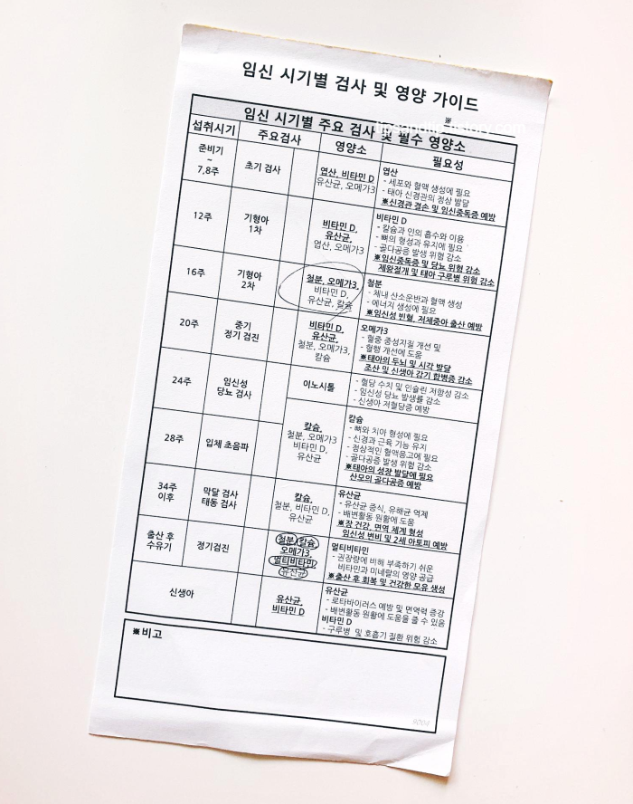 병원에서 준 임신 시기별 검사와 영양 가이드 표에요. 초반에 받아뒀는데 어느새 34주 이후가 되었네요. 이때부터는 오메가3는 복용을 중단해야 해요. 지혈이 안 되어서 출산할 때 문제가 생길 수 있다고 합니다. 저는 오메가3를 선물 받아서 먹어서 자세히 알아보지 않았는데, 최근 검색해보니 식물성인지 캡슐 재질이 뭔지, 어떤 방식으로 추출했는지 다 따지고 먹어야 하더라구요. ㅠ-ㅠ 출산 후에는 잘 알아보고 구매해서 먹으려고 해요. 유산균은 출산 후에도 계속 먹어줘야 합니다.